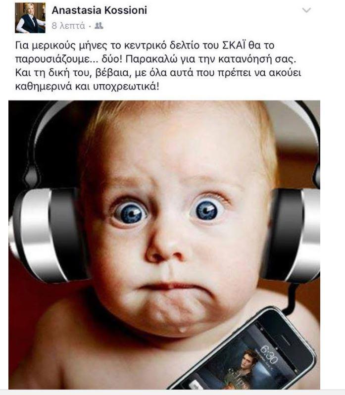 Συγκεκριμένα η Σία Κοσιώνη ανακοίνωσε την ευχάριστη είδηση, με μια ανάρτησή της στο Facebook, ζητώντας, μεταξύ άλλων, την.... κατανόηση του κοινού καθώς, όπως έγραψε, το δελτίο ειδήσεων, για κάποιο διάστημα θα το παρουσιάζουν... δύο!
