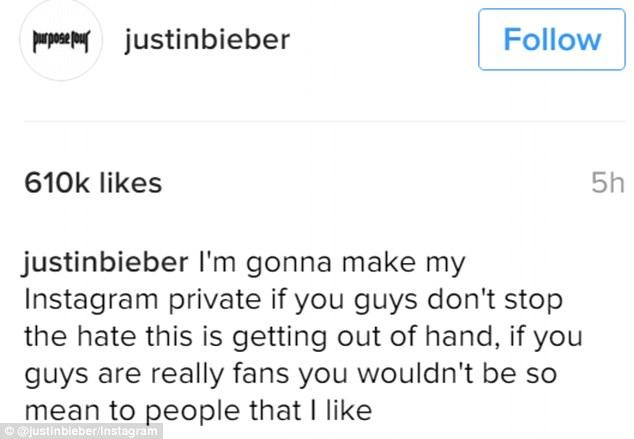 Ο Τζάστιν Μπίμπερ έχει μία τεράστια βάση followers, αλλά πλέον πρέπει να αποφασίσει και να διαλέξει ανάμεσα σε αυτούς και στη νέα του κοπέλα όπως δείχνουν οι νέες φωτογραφίες που ανέβασε στα μέσα κοινωνικής δικτύωσης. Ο νεαρός σούπερ σταρ ανέβασε στο λογαριασμό του στο Instagram φωτογραφίες που τον δείχνουν με τη νέα του φίλη, Σοφία Ρίτσι. Η Ρίτσι είναι ένα 17χρονο μοντέλο και κόρη του τραγουδιστή και τραγουδοποιού Λάιονελ Ρίτσι και τις τελευταίες εβδομάδες φαίνεται να απολαμβάνει την συντροφιά του 22χρονου ποπ σταρ. Όμως οι φωτογραφίες δεν άρεσαν μάλλον στους followers του Μπίμπερ, καθώς τα περισσότερα σχόλια δεν ήταν και τόσο καλά. Αυτό εξόργισε τον τραγουδιστή και απείλησε να αποκλείσει αυτούς που σχολιάζουν αρνητικά, δημιουργώντας πανικό στους Beliebers. «Θα με αναγκάσετε να κάνω το Instagram μου ιδιωτικό αν εσείς δεν σταματήσετε να σχολιάζετε αρνητικά», έγραψε κάτω από μία ασπρόμαυρη φωτογραφία του μαζί με την Ρίτσι. «Δεν είναι στο χέρι μου, αν όμως είστε πραγματικοί θαυμαστές μου δεν θα έπρεπε να συμπεριφέρεστε με αυτόν τον τρόπο στους ανθρώπους που μου αρέσουν».