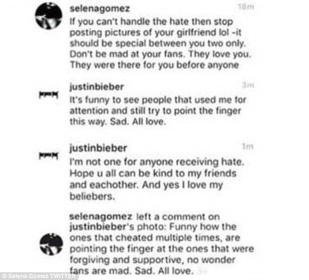 Στην κόντρα αυτή πήρε θέση και η πρώην του Μπίμπερ Σελένα Γκόμεζ που έγραψε: "αν δεν μπορείς να αντιμετωπίσεις τις εκδηλώσεις μίσους, τότε σταμάτα να ανεβάζεις φωτογραφίες με τη φίλη σου...". Για να αρχίσει μια αντιπαράθεση μεταξύ τους, μέσα από τα μέσα κοινωνικής δικτύωσης. Τελικά η Σελένα, έγραψε πριν από λίγο Snapchat: "Αυτά που είπα ήταν άστοχα και εγωιστικά".