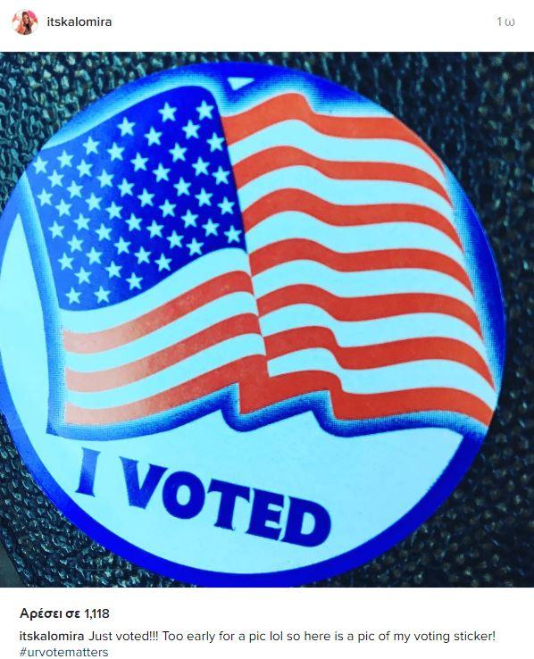 Στον παλμό των προεδρικών εκλογών βρίσκεται η Αμερική και όπως είναι φυσικό το θέμα απασχολεί τον τελευταίο καιρό τα μέσα μαζικής ενημέρωσης. Η Καλομοίρα ανέβασε μία φωτογραφία στον προσωπικό της λογαριασμό στο Instagram αμέσως μετά την ψήφο της. Η ίδια μάλιστα τονίζει τη σημασία της ψήφου. Δείτε τί ανέβασε: