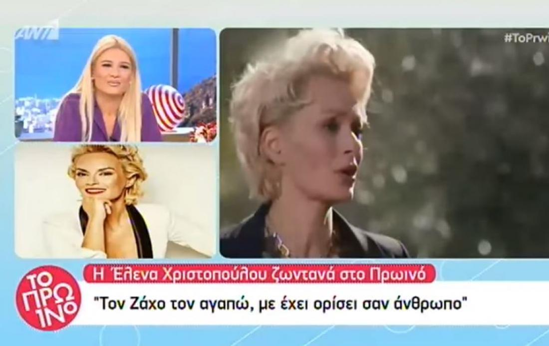 «Αφενός είμαι ωραία, αφετέρου δεν μπορώ να ράψω ούτε κουμπί, θέλω να το τονίσω αυτό. Γελάω, τι να κάνω; Τον Ζάχο τον αγαπώ, με έχει ορίσει σαν άνθρωπος, είναι ο μέντοράς μου, είναι ο άνθρωπος που λατρεύω. Σχέση δεν είχαμε ποτέ, θα ήθελα αλλά γεννήθηκα 54 χρόνια αργότερα από εκείνον. Μου πέφτει λίγο μικρός. Με έχει βοηθήσεις στις επιλογές μου πάρα πολύ, στον γάμο μου ήταν εκεί, στο νοσοκομείο ήταν δίπλα μου, πάντα ήταν εκεί. Έχω ζήσει όλες τις μεγάλες του σχέσεις, ζηλεύοντας γιατί εγώ δεν είμαι μεγαλύτερη να κάνω σχέση μαζί του», είπε η αρχικά η Έλενα Χριστοπούλου.