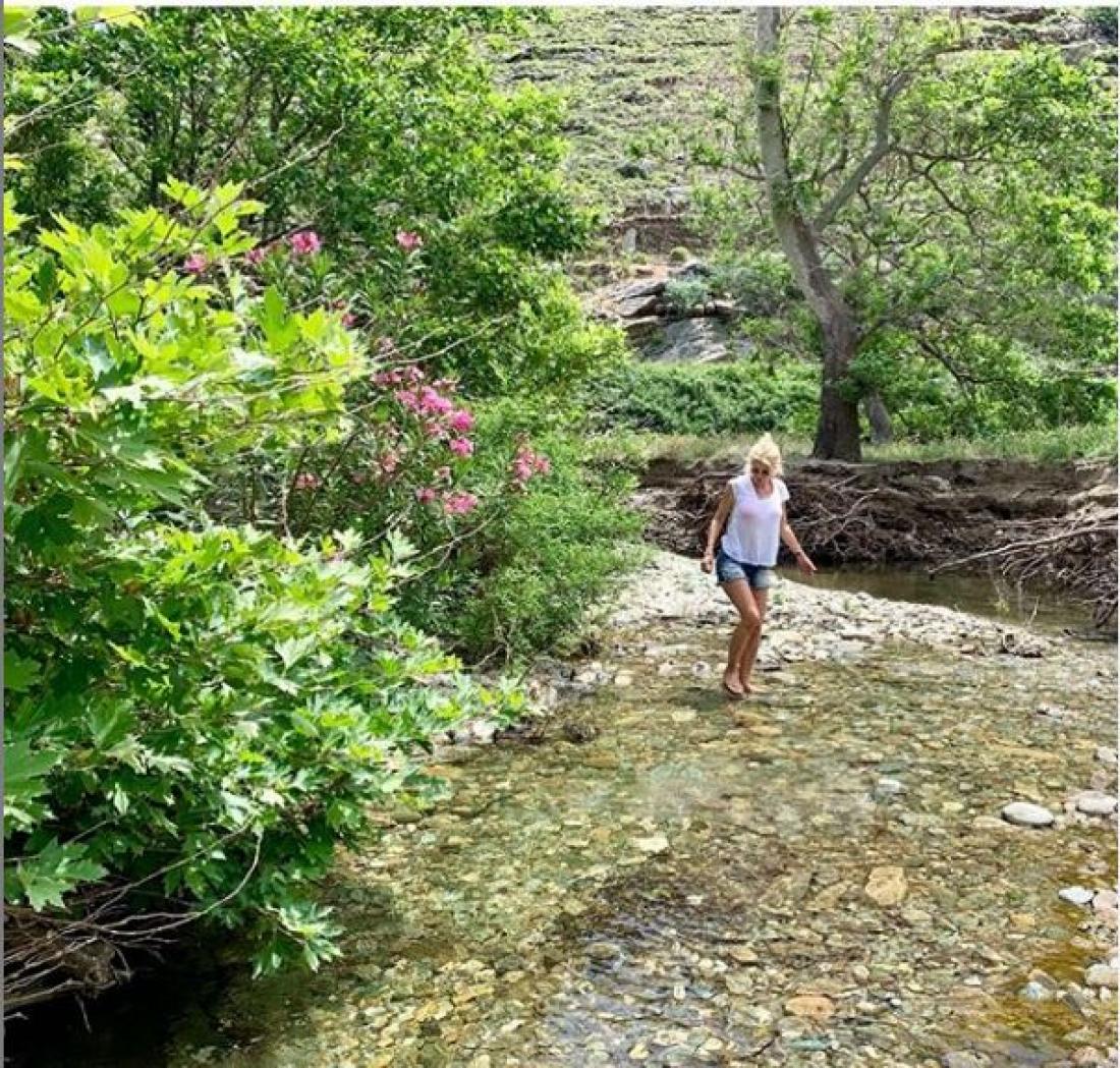 Σήμερα ανέβασε στο λογαριασμό της στο Instagram μια φωτογραφία της να ποζάρει σε έναν αγρό. Η Ελένη Μενεγάκη σχολίασε τη φωτογραφία της γράφοντας: «Στο νησί …#andros #cyclades_islands #visitgreece #onarexperience».