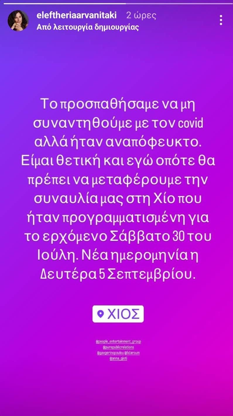 «Το προσπαθήσαμε να μη συναντηθούμε με τον covid αλλά ήταν αναπόφευκτο. Είμαι θετική και εγώ οπότε θα πρέπει να μεταφέρουμε την συναυλία μας στη Χίο που ήταν προγραμματισμένη για το ερχόμενο Σάββατο 30 του Ιούλη. Νέα ημερομηνία Δευτέρα 5 Σεπτεμβρίου», έγραψεη Ελευθερία Αρβανιτάκη.