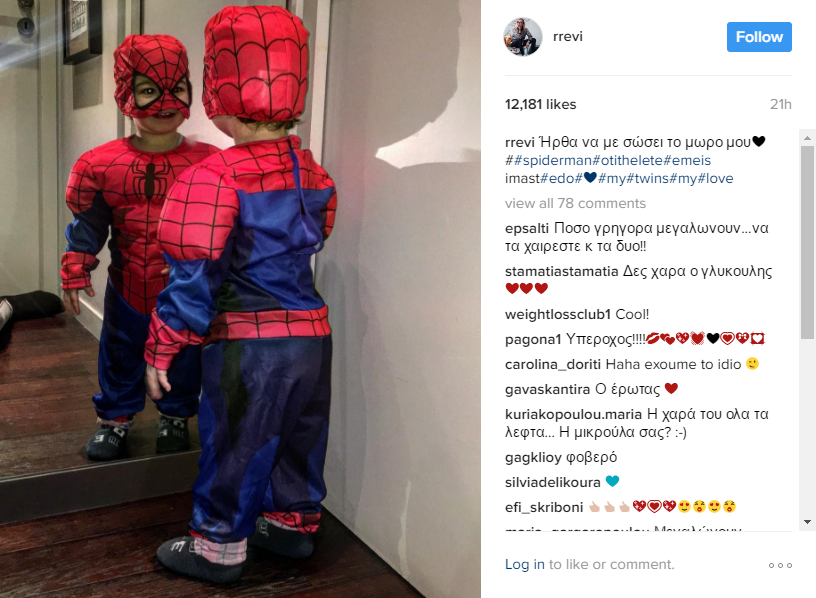 Σήμερα, Τσικνοπέμπτη, έχοντας μπει για τα καλά στο πνεύμα των ημερών, η γνωστή φωτογράφος ανήρτησε φωτογραφία με τον μικρό της γιο ντυμένο Spiderman, διάσημο υπερήρωα της Marvel. Σε αυτή την πολύ γλυκιά στιγμή, η Ρεβή έγραψε "Ήρθε να με σώσει το μωρό μου".