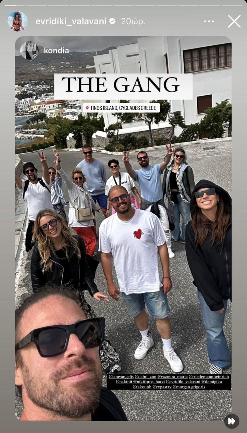 Μέσα από τον προσωπικό της λογαριασμό στο Instagram, η Ευρυδίκη Βαλαβάνη αναδημοσίευσε μια φωτογραφία όπου ποζάρει με την παρέα της και τον Γρηγόρη Μόργκαν στο νησί της Τήνου.
