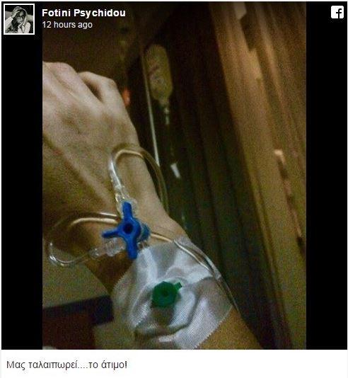 Η δημοσιογράφος, αργά το βράδυ της Κυριακής 30 Οκτωβρίου, ανάρτησε στον προσωπικό της λογαριασμό στο Facebook μια φωτογραφία με τον ορό στο χέρι της, γράφοντας στη λεζάντα που τη συνόδευε: «Μας ταλαιπωρεί το άτιμο!» .