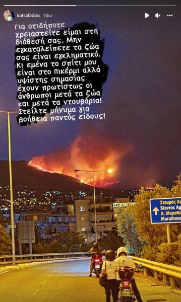 «Η φωτιά έξω απ’το δικό μας σπίτι όπως και στο σπίτι κάθε ανθρώπου που περνάει δραματικές ώρες αυτές τις στιγμές. Άνθρωποι υποφέρουν, ζωάκια καίγονται, σπίτια του κόσμου που φτιάχτηκαν με κόπους ζωής χάνονται», αναφέρει σε ανάρτησή της, ζητώντας παράλληλα από όποιον έχει ανάγκη να επικοινωνήσει μαζί της προκειμένου να βοηθήσει με όποιον τρόπο μπορεί.