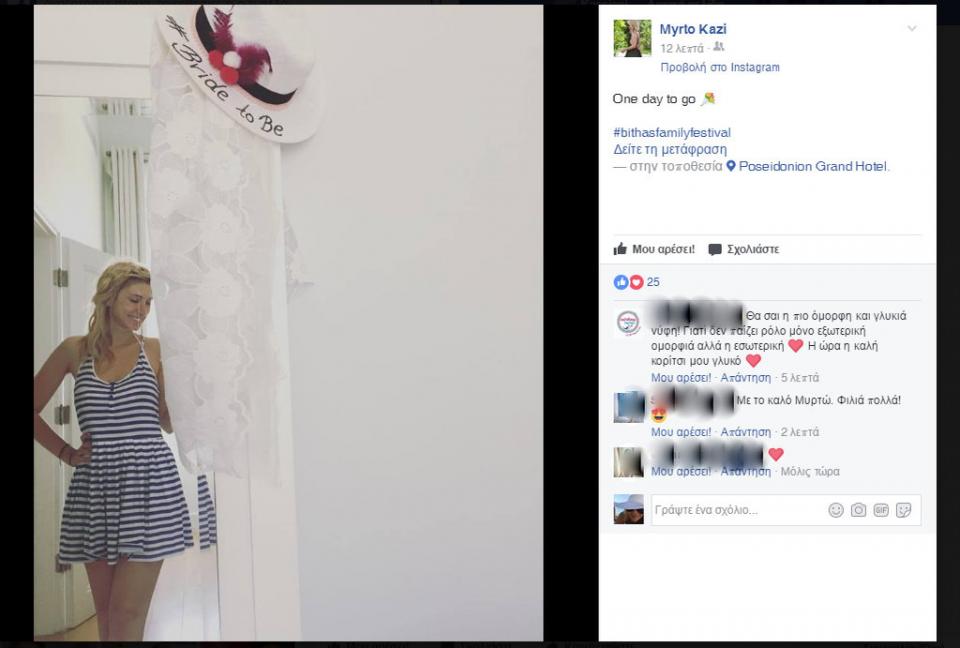 Η χαρούμενη νύφη έχει ανεβάσει φωτογραφίες στα social media που φανερώνουν τη χαρά της και την αγωνία της για την αυριανή μέρα και περιμένει συγγενείς και φίλους την ωραιότερη μέρα της ζωής της.