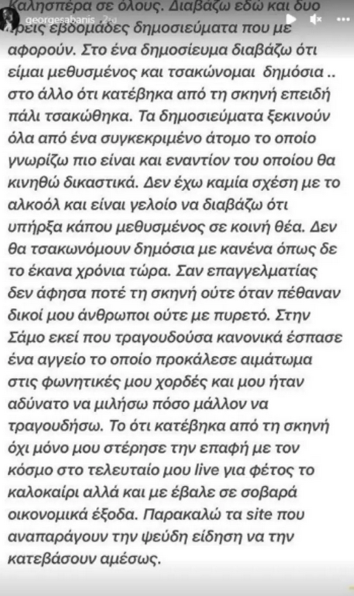 «Καλησπέρα σε όλους. Διαβάζω εδώ και δύο και τρεις εβδομάδες δημοσιεύματα που με αφορούν. Στο ένα δημοσίευμα διαβάζω ότι είμαι μεθυσμένος και τσακώνομαι δημόσια, στο άλλο ότι κατέβηκα από τη σκηνή επειδή πάλι τσακώθηκα. Τα δημοσιεύματα ξεκινούν όλα από ένα συγκεκριμένο άτομο το οποίο γνωρίζω ποιο είναι και εναντίον του οποίου θα κινηθώ δικαστικά. Δεν έχω καμία σχέση με το αλκοόλ και είναι γελοίο να διαβάζω ότι υπήρξα κάπου μεθυσμένος σε κοινή θέα. Δεν θα τσακωνόμουν δημόσια με κανένα όπως δεν το έκανα χρόνια τώρα. Σαν επαγγελματίας δεν άφησα ποτέ τη σκηνή ούτε όταν πέθαναν δικοί μου άνθρωποι, ούτε με πυρετό. Στην Σάμο εκεί που τραγουδούσα κανονικά έσπασε ένα αγγείο το οποίο προκάλεσε αιμάτωμα στις φωνητικές μου χορδές και μου ήταν αδύνατο να μιλήσω πόσο μάλλον να τραγουδήσω. Το ότι κατέβηκα από τη σκηνή όχι μόνο μου στέρησε την επαφή με τον κόσμο στο τελευταίο μου live για φέτος το καλοκαίρι αλλά και με έβαλε σε σοβαρά οικονομικά έξοδα. Παρακαλώ τα site που αναπαράγουν την ψεύδη είδηση να την κατεβάσουν αμέσως».