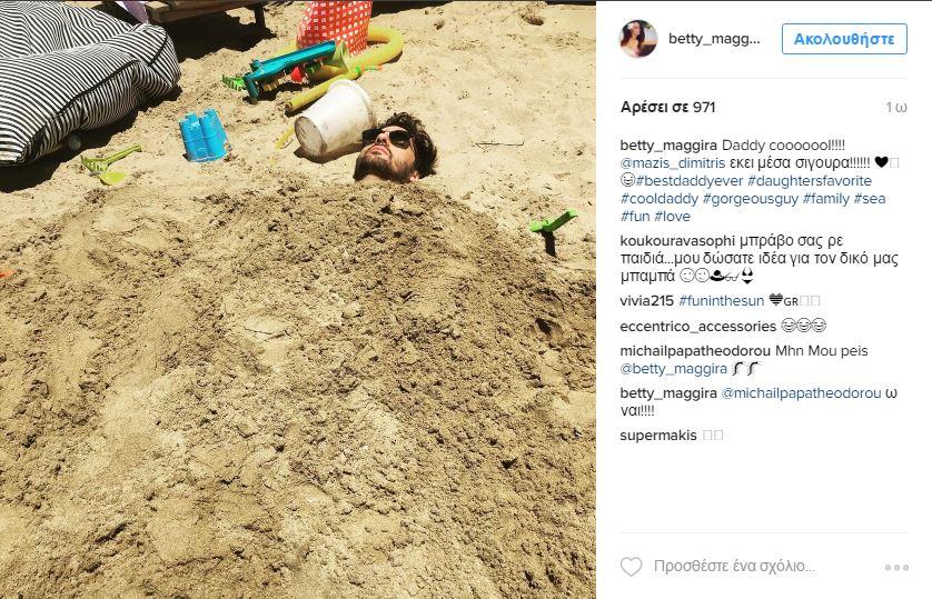Ο σύζυγος της Μπέτυ Μαγγίρα, Δημήτρης Μάζης, καλύφθηκε με άμμο και ίσα ίσα που μπορεί να αναπνεύσει ο άνθρωπος! Είναι πάντως αστείο...