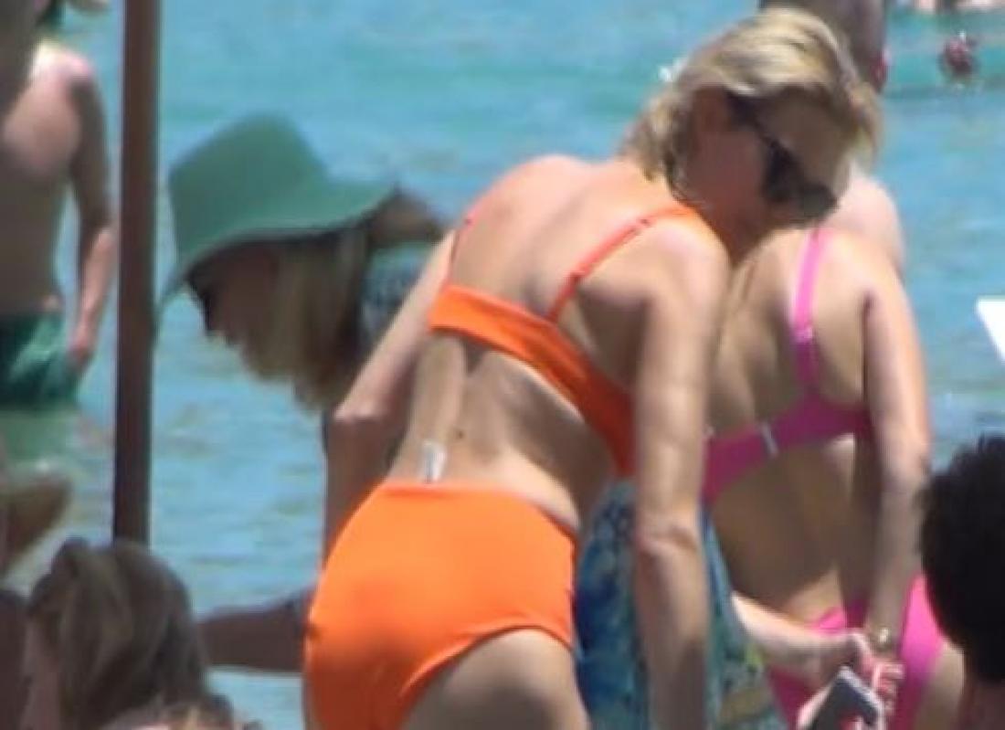 Η κάμερα του τους εντόπισε σε κοσμική παραλία να απολαμβάνουν τον ήλιο και την θάλασσα. Η παρουσιάστρια φορώντας πορτοκαλί ψηλόμεσο μπικίνι που τόνιζε το καλλίγραμμο σώμα της τράβηξε όλα τα βλέμματα πάνω της.