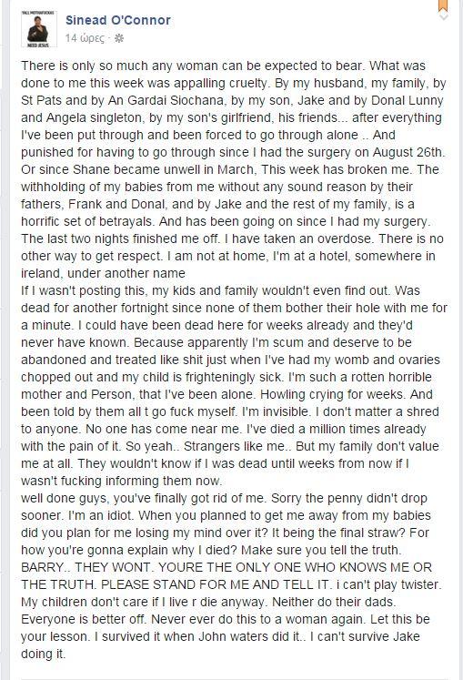 Η μουσικός και μητέρα τεσσάρων παιδιών, προκάλεσε ανησυχίες για απόπειρα αυτοκτονίας, όταν έγραψε το 2015, στον λογαριασμό της στο facebook: «Οι τελευταίες δύο νύχτες με αποτελείωσαν. Έχω πάρει υπερβολική δόση. Δεν υπάρχει άλλος τρόπος για να κερδίσω το σεβασμό. Δεν είμαι στο σπίτι μου, είμαι σε ένα ξενοδοχείο κάπου στην Ιρλανδία, με άλλο όνομα. Αν δεν έκανα αυτή την ανάρτηση, τα παιδιά μου και η οικογένειά μου δεν θα το μάθαιναν. Θα μπορούσα να ήμουν νεκρή εδώ για εβδομάδες και κανείς να μην το μάθει. Είμαι τόσο φρικτή μητέρα και άτομο, που έχω μείνει μόνη μου», ήταν το μήνυμα που προκάλεσε πανικό στους θαυμαστές της. Αμέσως σήμανε συναγερμός στις αρχές και αστυνομικοί έσπευσαν στο δωμάτιο του ξενοδοχείου της και η Sinead O'Connor μεταφέρθηκε σε νοσοκομείο, ενώ περισσότερα από χίλια μηνύματα συμπαράστασης γράφτηκαν κάτω από την ανάρτησή της μέσα σε λίγη ώρα.