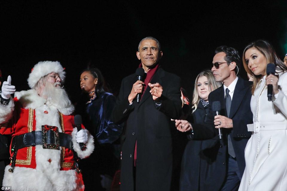 Οι οικογένεια Ομπάμα ανέβηκε στην σκηνή μετά την εμφάνιση της Κέλι Κλάρκσον και άρχισε να μετρά αντίστροφα από το πέντε μπροστά σε ένα ενθουσιώδες κοινό, αλλά και σε απίστευτο κρύο γαι να πατήσουν το κουμπί που άναωε τα μπλε, κόκκινα και άσπρα φώτα.