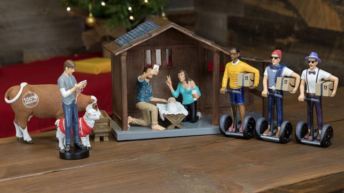 Ο Ιωσήφ νανουρίζει τον μικρό Χριστό και βγάζει selfie, ενώ η Παναγία κάνει duckface. Οι μάγοι φέρνουν τα δώρα τους με segways, ενώ οι βοσκοί έχουν τάμπλετ και τα ζώα παράγουν μόνο οργανικά ποϊόντα και φυσικά χωρίς γλουτένη.
