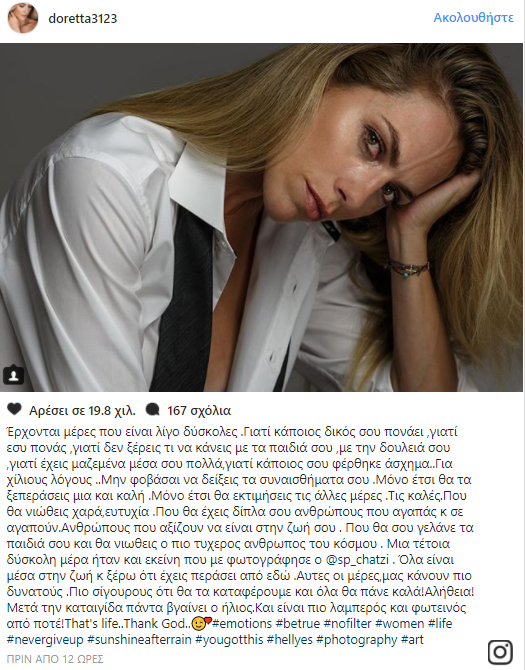 Επισημαίνοντας πως μια τέτοια δύσκολη μέρα ήταν και εκείνη κατά την οποία έκανε την εν λόγω φωτογράφιση, αλλά χωρίς να αποκαλύψει περισσότερες λεπτομέρειες, κατέληξε: «όλα είναι μέσα στην ζωή κ ξέρω ότι έχεις περάσει από εδώ. Αυτές οι μέρες μας κάνουν πιο δυνατούς. Πιο σίγουρους ότι θα τα καταφέρουμε και όλα θα πάνε καλά! Αλήθεια! Μετά την καταιγίδα πάντα βγαίνει ο ήλιος. Και είναι πιο λαμπερός και φωτεινός από ποτέ! That's life... Thank God».