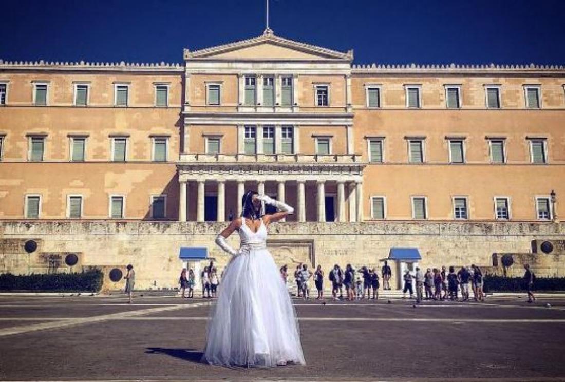 Η Δήμητρα Αλεξανδράκη με νυφικό έξω από τη Βουλή περιμένει τον καλό της