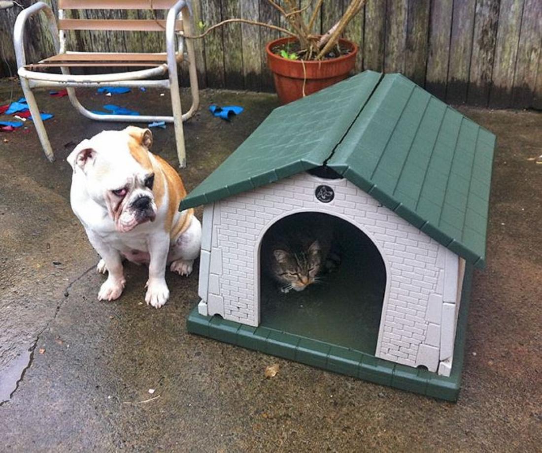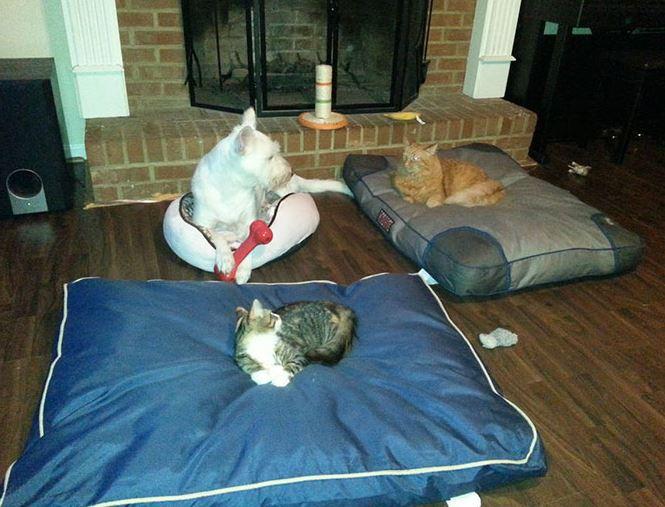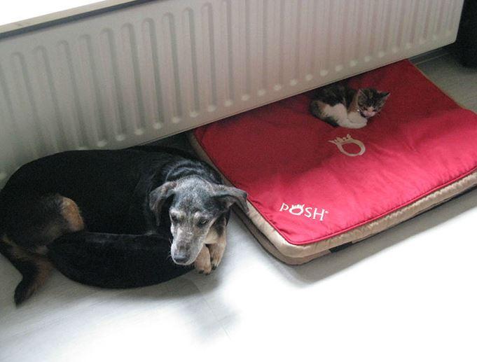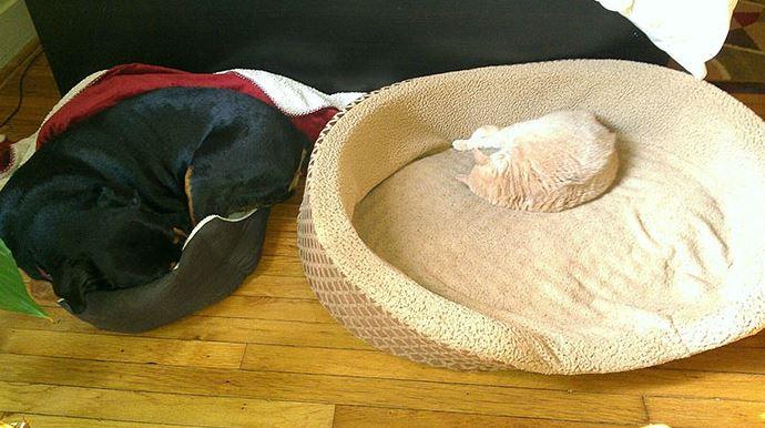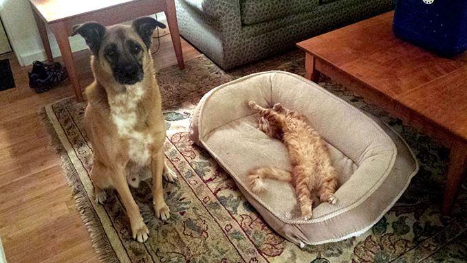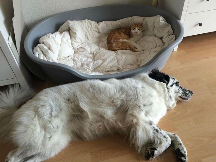 Αυτό που λέμε σαν τον σκύλο με την γάτα...! Γάτες και σκύλοι στον ίδιο χώρο μπορεί να προκαλέσουν χαμό, αφού προσπαθεί ο καθένας να διεκδικήσει τον χώρο που του ανήκει. Στις παρακάτω φωτογραφίες οι γάτες "κλέβουν" τα κρεβατάκια ύπνου των σκύλων και αυτοί στριμώχνονται στο μαξιλαράκι της γάτας.