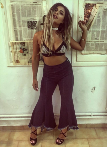 Στον προσωπικό λογαριασμό της στο πόζαρε με ένα παλιομοδίτικο τζιν καμπάνα και ένα σουτιέν που αναδείκνυε το μπούστο της, λίγο πριν ανέβει στη σκηνή και αντιληφθούν όλοι την καυτή της παρουσία.