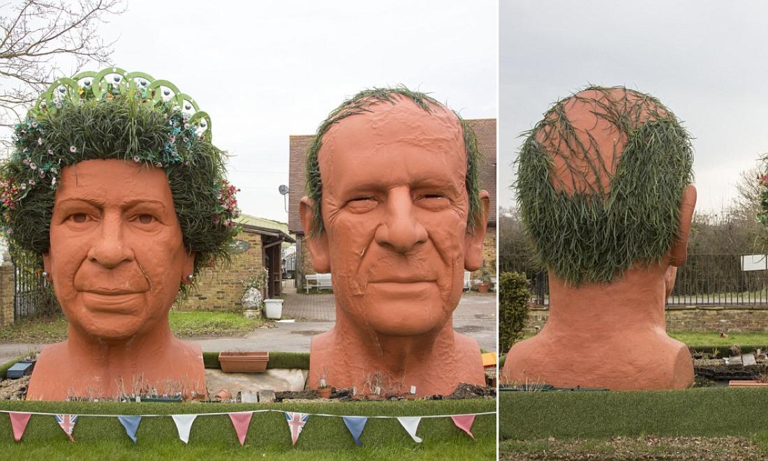 Σίγουρα είναι από τους πιο ασυνήθιστους τρόπους για να αποτίσει κάποιος φόρο τιμής στην βασίλισσα Ελισάβετ: Δύο τεράστια κεφάλια --το δικό της και του πρίγκιπα Φίλιππου--κοσμούν τον κήπο του συνταξιούχου Μπεν Μπένετ στο 'Οκλεϊ Γκριν του Γουίνσδορ.