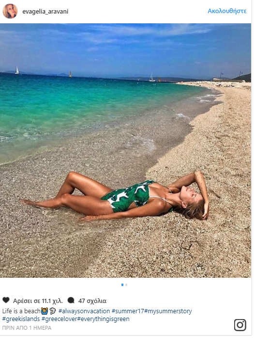 Συνεχίζει και απολαμβάνει τις διακοπές της η Ευαγγελία Αραβανή λίγο πριν ξεκινήσουν και πάλι οι τηλεοπτικές υποχρεώσεις. Αλλά τα πλατό μπορούν να περιμένουν καθώς η πανέμορφη παρουσιάστρια γεμίζει μπαταρίες γεμάτες με ήλιο και υπέροχα νερά.
