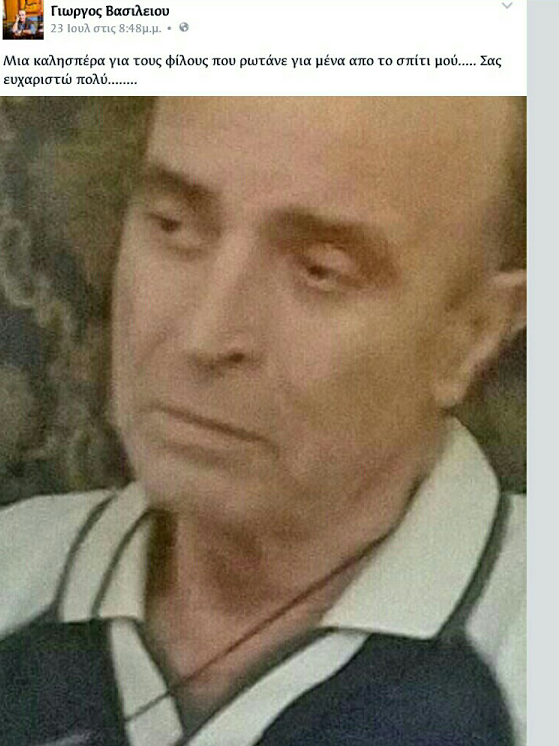 Ο Γιώργος Βασιλείου μεταφέρθηκε σπίτι για να τη συνεχίσει από εκεί τη θεραπεία και λίγο μετά τις 8 το βράδυ του Σαββάτου «ανέβασε» στο facebook φωτογραφία του στο σπίτι και έγραψε: