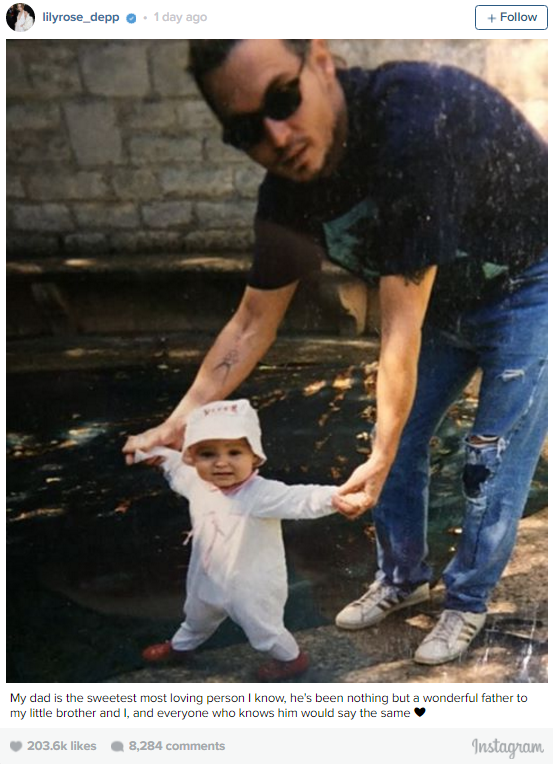 Η Λίλη Ρόουζ Ντεπ δεν βγήκε δημόσια να πάρει το μέρος του πατέρα της στη διαμάχη του με την Αμπερ Χερντ, δεν έκανε καμιά μελοδραματική ανακοίνωση, απλώς ανέβασε στο Instagram μια τρυφερή φωτογραφία μαζί με τον μπαμπά της όταν εκείνη ήταν μωρό, γράφοντας: "Ο μπαμπάς μου είναι ο πιο γλυκός και αξιαγάπητος άνθρωπος στον κόσμο. Για μένα και τον μικρό μου αδελφό είναι ο πιο καταπληκτικός μπαμπάς του κόσμου και όσοι τον γνωρίζουν, θα πουν το ίδιο".