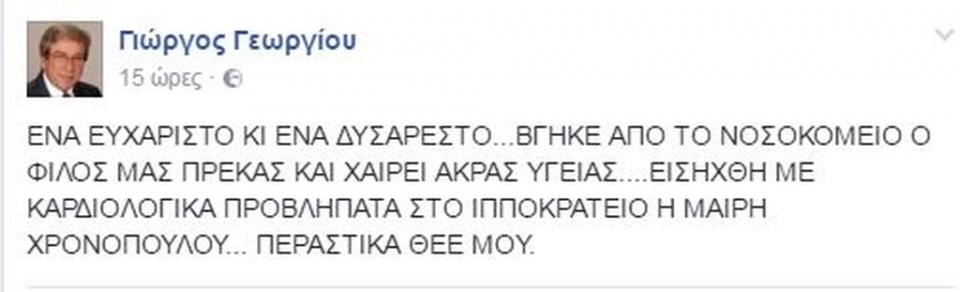 «ΕΝΑ ΕΥΧΑΡΙΣΤΟ ΚΙ ΕΝΑ ΔΥΣΑΡΕΣΤΟ...ΒΓΗΚΕ ΑΠΟ ΤΟ Ο ΦΙΛΟΣ ΜΑΣ ΠΡΕΚΑΣ ΚΑΙ ΧΑΙΡΕΙ ΑΚΡΑΣ ΥΓΕΙΑΣ....ΕΙΣΗΧΘΗ ΜΕ ΚΑΡΔΙΟΛΟΓΙΚΑ ΠΡΟΒΛΗΜΑΤΑ ΣΤΟ ΙΠΠΟΚΡΑΤΕΙΟ Η ΜΑΙΡΗ ΧΡΟΝΟΠΟΥΛΟΥ... ΠΕΡΑΣΤΙΚΑ ΘΕΕ ΜΟΥ.».