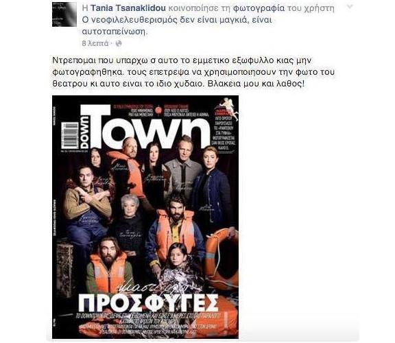 Το εξώφυλλο του περιοδικού Down Town απεικονίζει πλειάδα καλλιτεχνών και εκπροσώπων των ΜΜΕ με σωσίβια, ενώ αναγράφεται, «Είμαστε όλοι πρόσφυγες».