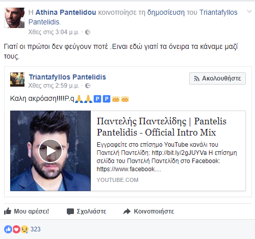Το συγκεκριμένο βίντεο δημοσίευσε και η μητέρα του τραγουδιστή, Αθηνά Παντελίδου, γράφοντας τη λεζάντα: «Γιατί οι πρώτοι δεν φεύγουν ποτέ. Είναι εδώ γιατί τα όνειρα τα κάναμε μαζί τους».