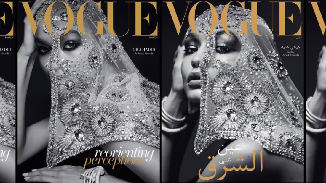 Η Χαντίντ εμφανίζεται σε δύο διαφορετικές φωτογραφίες για το εξώφυλλο του Vogue Arabia έχοντας στο κεφάλι της μια κεντημένη μαντίλα.