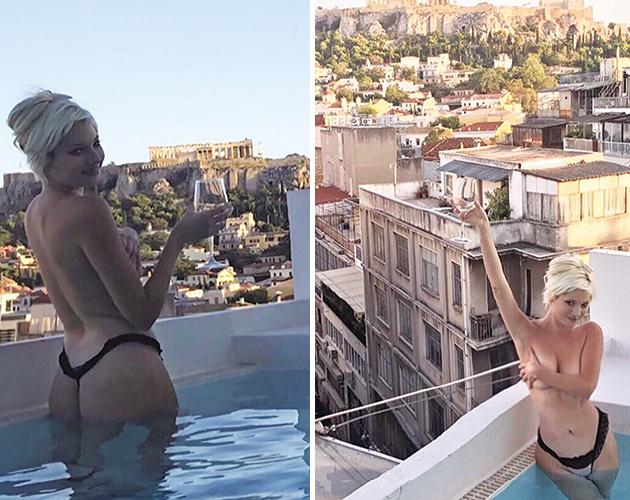 «Θρυλικό μέρος, θρυλική γυναίκα» έγραψε ως λεζάντα στο στιγμιότυπο όπου ποζάρει ανφάς, προφανώς κάνοντας αντιπαραβολή τον εαυτό της με το μνημείο-σύμβολο της ελληνικής πρωτεύουσας, ενώ σε εκείνο που στάθηκε με την όπισθεν στον φακό επισήμανε πως αυτό που βλέπουμε στο βάθος είναι η Ακρόπολη.