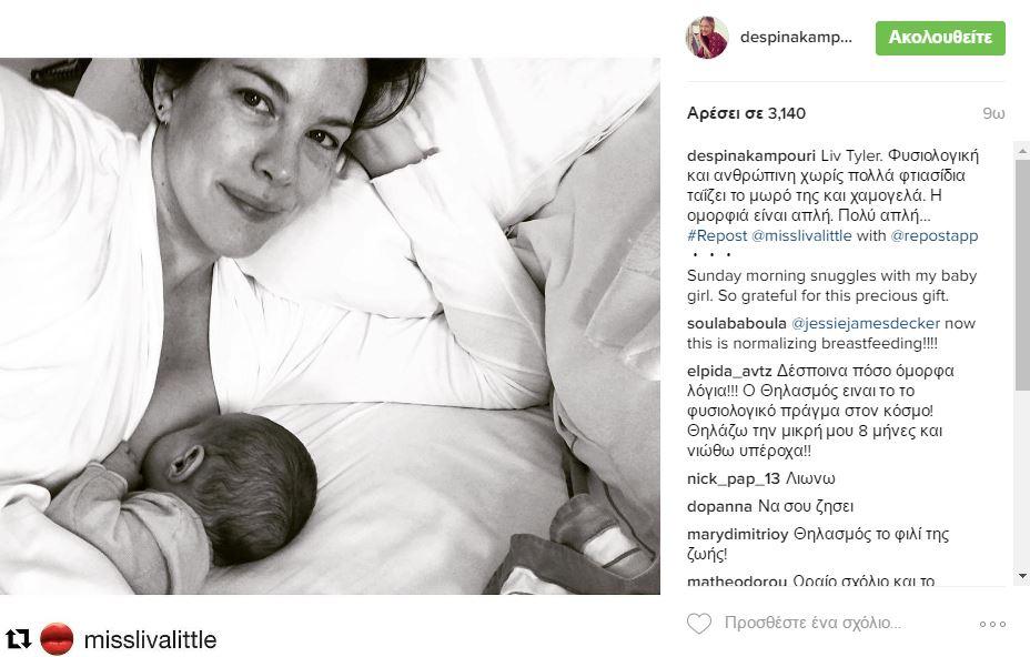 Η Λιβ Τέιλορ που πριν λίγο καιρό έγινε μανούλα, ανέβασε μια πολύ τρυφερή φωτογραφία της στο Instagram όπου θηλάζει το νεογέννητο μωρό της. Η φωτογραφία αυτή ήταν η αφορμή για να την κοινοποιήσει η Δέσποινα Καμπούρη στον λογαριασμό της, βρίσκοντας την σύμφωνη με την πράξη αυτή.