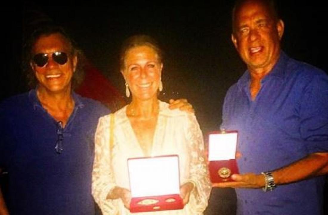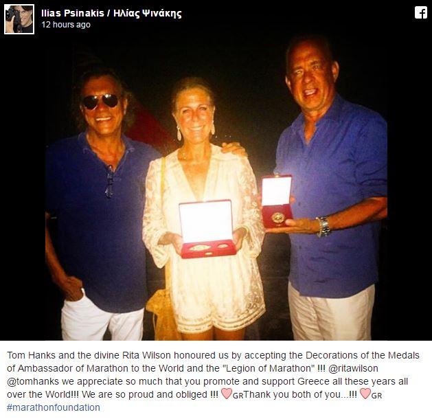 Ο δήμαρχος του Μαραθώνα Ηλίας Ψινάκης απένειμε στον διάσημο ηθοποιό Τομ Χανκς και τη σύζυγό του Ρίτα Γουίλσον, τα "Παράσημα της Λεγεώνας του Μαραθώνα"!