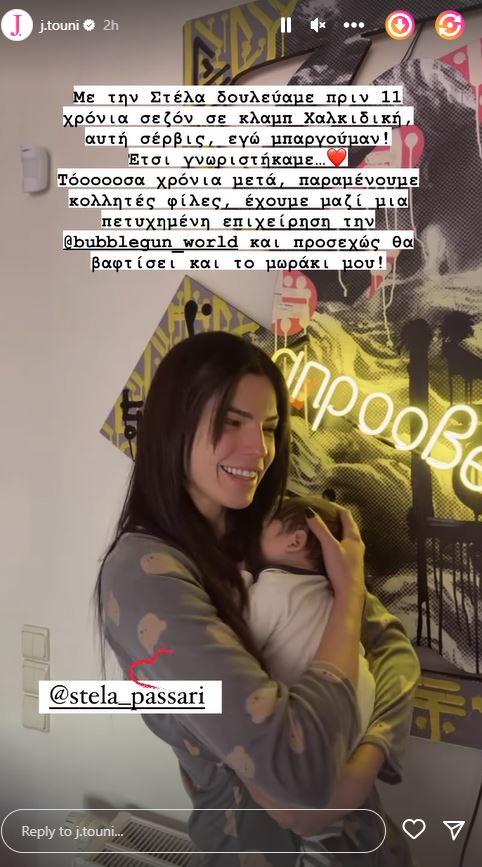 Μάλιστα, η Ιωάννα Τούνη αποκάλυψε μέσα από ένα Instagram story ποια θα είναι η νονά του παιδιού της. Συγκεκριμένα, η Ιωάννα Τούνη δημοσίευσε μία φωτογραφία με την κολλητή της φίλη και συνεργάτιδα, Στέλλα Πάσσαρη την στιγμή που κρατά στην αγκαλιά της το μικρό αποκαλύπτοντας πως εκείνη θα είναι η νονά της.