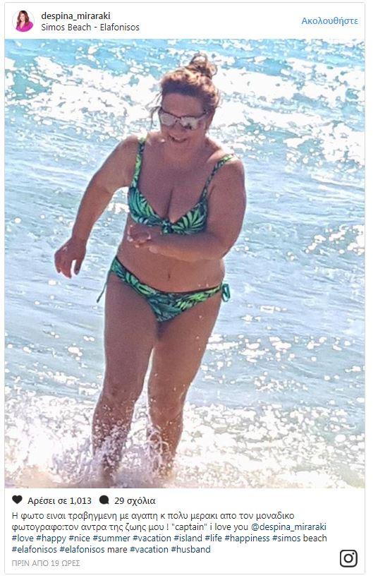 Δικαιολογώντας την απόφασή της να μοιραστεί με τους διαδικτυακούς της φίλους μία αρετουσάριστη φωτογραφία της με μπικίνι στο Instagram έγραψε: «Η φωτό είναι τραβηγμένη με αγάπη κ πολύ μεράκι από τον μοναδικό φωτογράφο: τον άντρα της ζωής μου ! «captain» i love you».