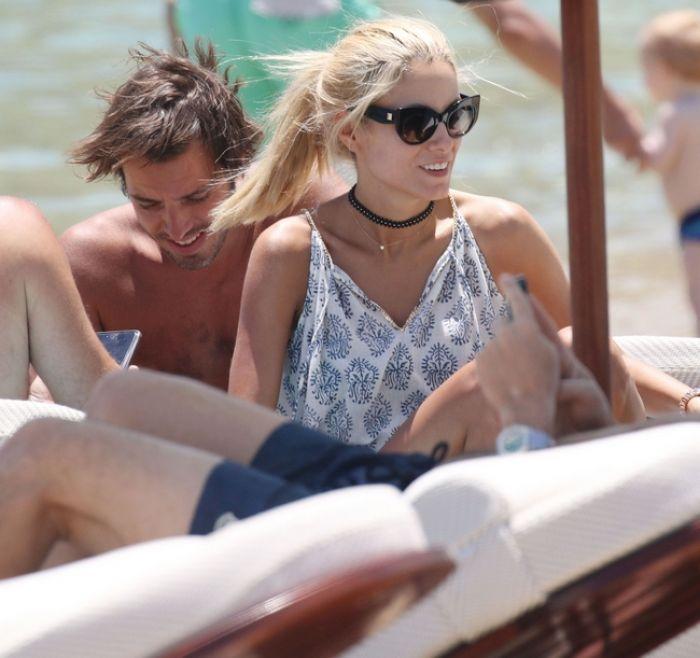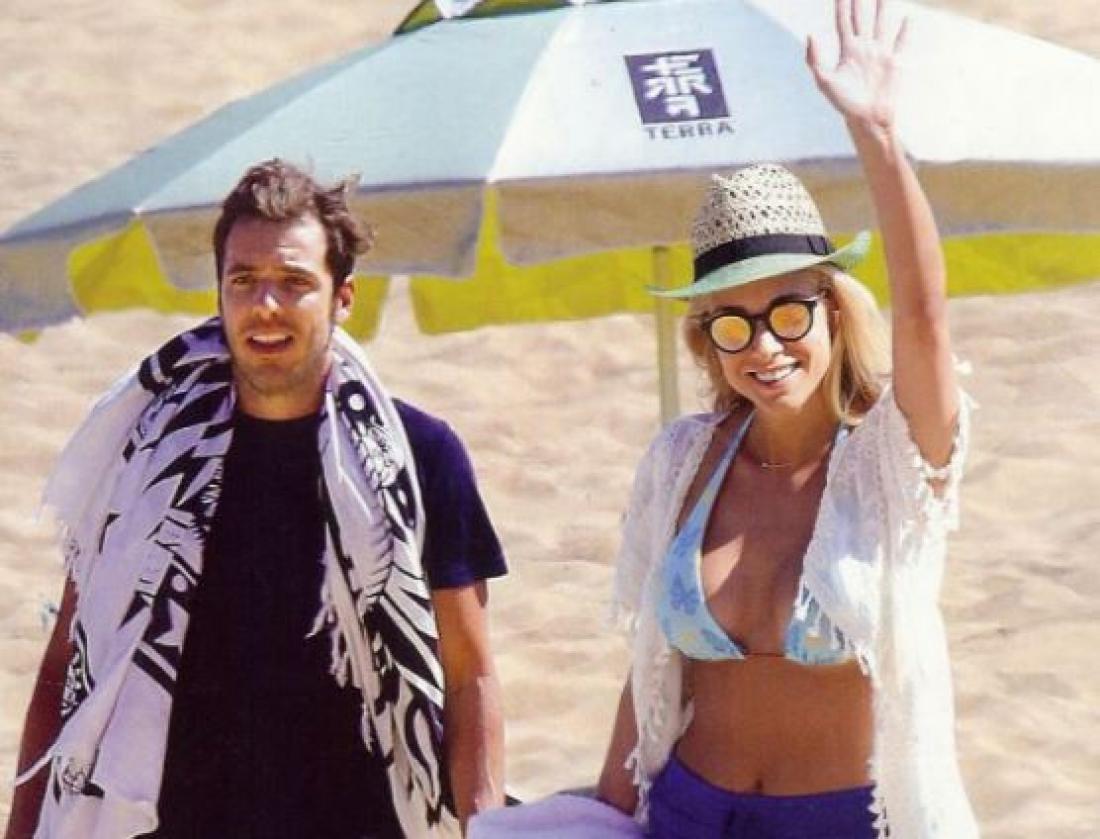 Η ξανθιά καλλονή εμφανίστηκε με ένα λευκό καφτάνι με μπλε μοτίβα και ένα ζευγάρι μαύρα γυαλιά, ενώ ο Δημήτρης Θεοδωρίδης εμφανίστηκε με μία μπλε βερμούδα και καπέλο ηλίου.