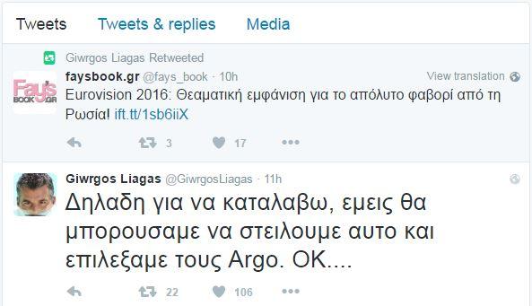 Ο Γιώργος Λιάγκας αμέσως μετά την εντυπωσιακή εμφάνιση της Ρωσίας στον ημιτελικό της Eurovision επέλεξε να σχολιάσει μέσα από το twitter την ελληνική συμμετοχή στον μουσικό διαγωνισμό.