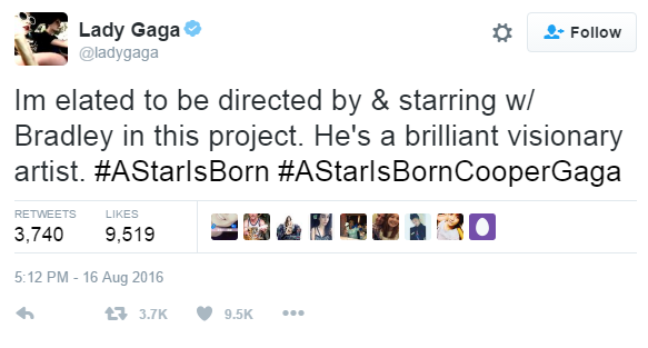 Η Lady Gaga επιβεβαίωσε χθες με ένα tweet της, τις φήμες που την ήθελαν να πρωταγωνιστεί στο διάσημο μιούζικαλ του Broadway "Ένα Αστέρι Γεννιέται". "Είμαι κατενθουσιασμένη που θα με σκηνοθετήσει και θα πρωταγωνιστήσει μαζί μου ο Μπράντλεϊ σε αυτό το πρότζεκτ. Είναι ένας πανέξυπνος καλλιτέχνης με όραμα." έγραψε η διάσημη τραγουδίστρια.