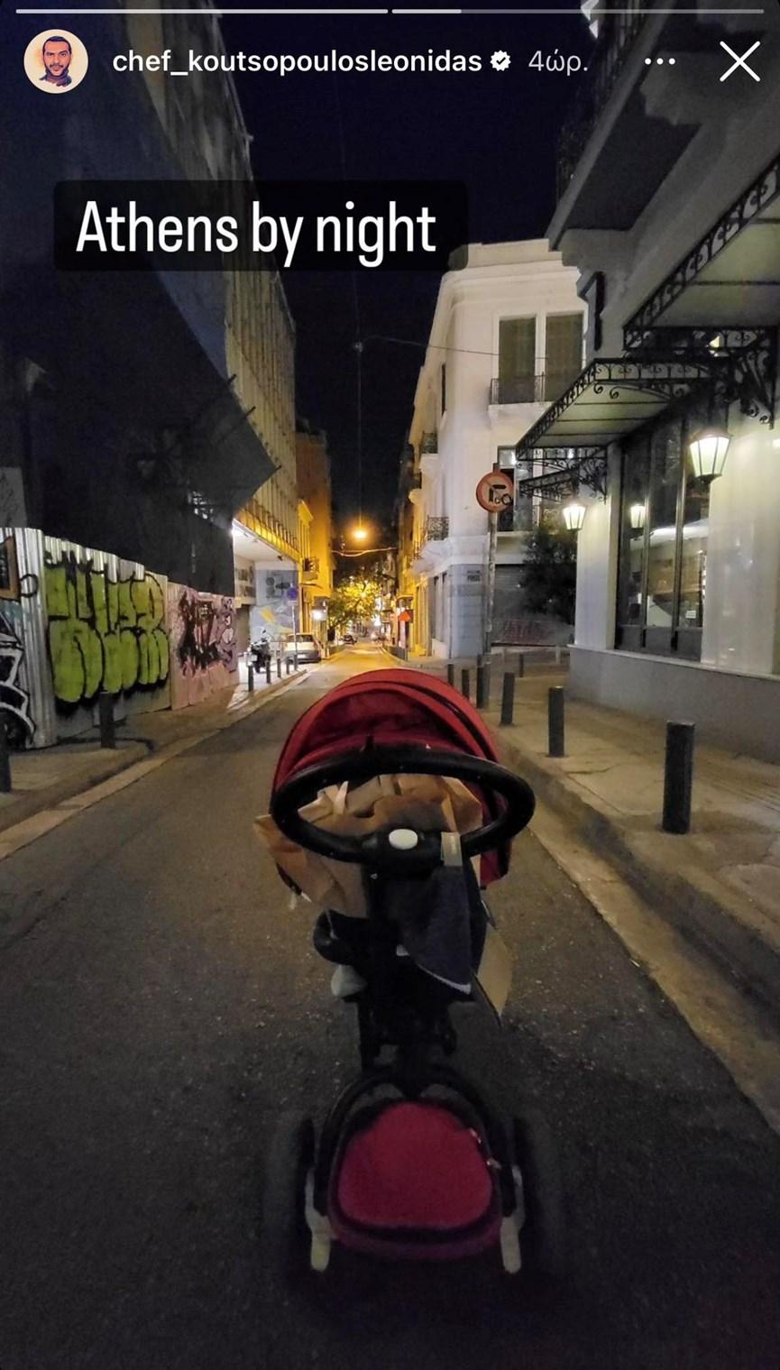 «Athens by night», έγραψε ο Λεωνίδας Κουτσόπουλος και φωτογράφισε το καρότσι του γιου του.