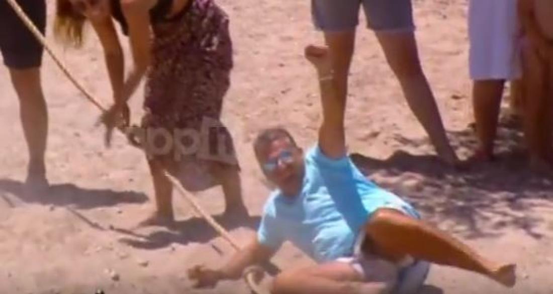 Το παιχνίδι εξελισσόταν με την ομάδα του Γιώργου να κερδίζει σε δύναμη. Πολύ σύντομα, λοιπόν, η Φαίη Σκορδά βρέθηκε ξαπλωμένη στην άμμο! Και ο Γιώργος, όμως, έπεσε φαρδύς πλατύς στην άμμο...