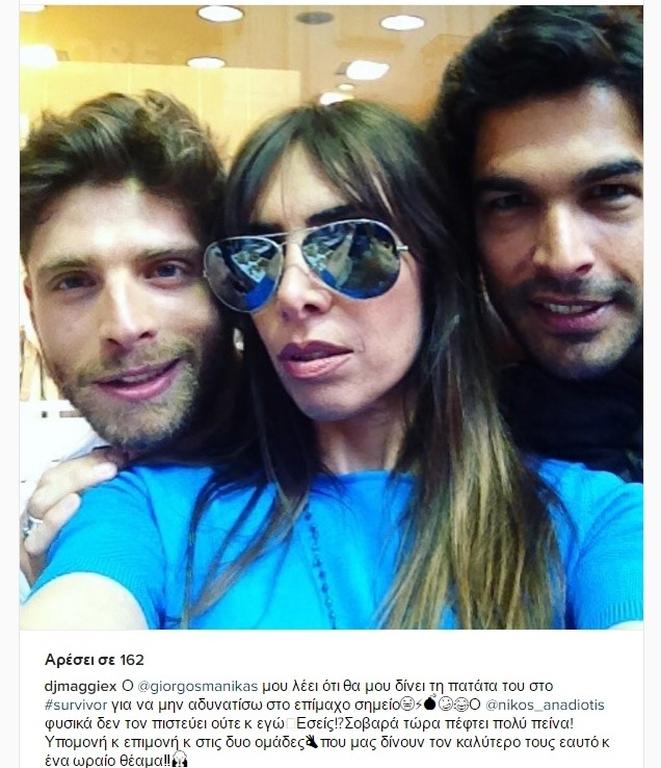 «Ο @giorgosmanikas μου λέει ότι θα μου δίνει τη πατάτα του στο #survivor για να μην αδυνατίσω στο επίμαχο σημείο. Ο @nikos_anadiotis φυσικά δεν τον πιστεύει ούτε κ εγώ? Εσείς⁉️ Σοβαρά τώρα πέφτει πολύ πείνα! Υπομονή κ επιμονή κ στις δυο ομάδες που μας δίνουν τον καλύτερο τους εαυτό κ ένα ωραίο θέαμα‼».