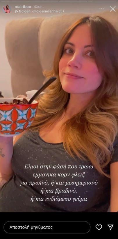 Ωστόσο, πριν από λίγες ώρες η Μαίρη Συνατσάκη αποκάλυψε μέσα από ένα Instagram story την εμμονική διατροφική της συνήθεια. Συγκεκριμένα, δημοσίευσε μία φωτογραφία που τρώει κορν φλειξ ενώ σημείωσε πως μπορεί να είναι το κύριο γεύμα της για το πρωί, το μεσημέρι αλλά και το βράδυ.