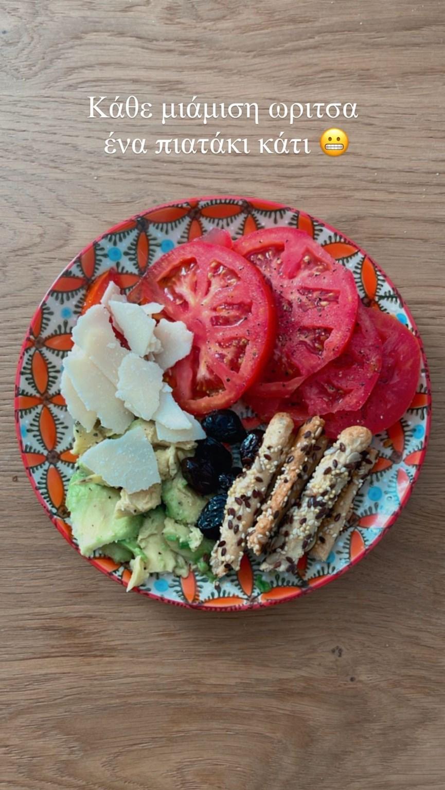 Η Μαίρη Συνατσάκη έφαγε ένα πιάτο με κριτσίνια, ελιές, ντομάτα, τυρί και αβοκάντο, ενώ παράλληλα αποκάλυψε πως πεινάει κάθε μιάμιση ώρα.