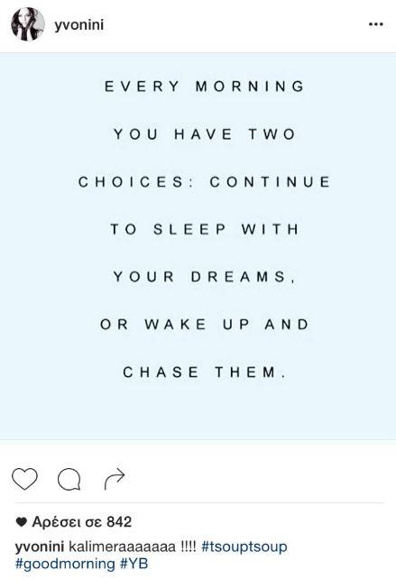 Kαι ενώ τις τελευταίες ημέρες φούντωσαν οι φήμες πως η Υβόννη Μπόσνιακ και ο Αντώνης Ρέμος περιμένουν το δεύτερο παιδάκι τους , σήμερα το πρωί η όμορφη Υβόννη ανήρτησε στο Instagram ένα μήνυμα ! Το οποίο έλεγε: every morning you have two choices: to sleep with your dreams or wake up and chase them, δηλαδή :Κάθε πρωί έχεις δύο επιλογές: Να συνεχίσεις να κοιμάσαι και να ονειρεύεσαι ή να ξυπνήσεις και να κυνηγήσεις τα όνειρά σου».