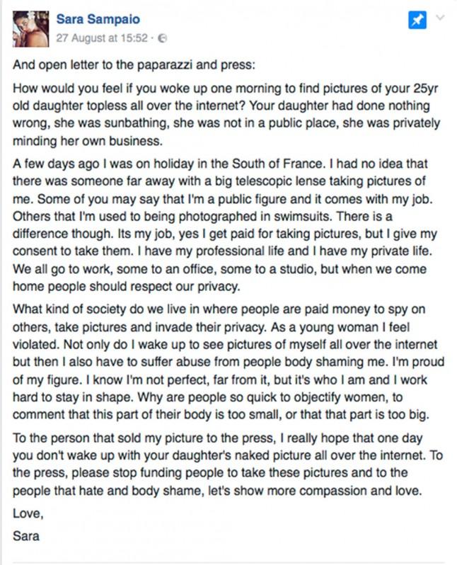 Η Σάρα Σαμπάιο επέλεξε το Facebook για να απευθυνθεί στους παπαράτσι που την φωτογράφισαν τόπλες πάνω σε σκάφος στη νότια Γαλλία με τον σύντροφό της εκατομμυριούχο 'Ολιβερ Ριπλέϊ.