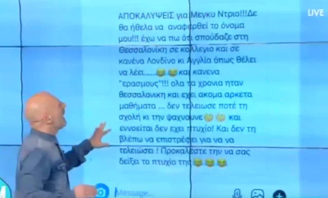 Ο παρουσιαστής, διάβασε ένα μήνυμα από τηλεθεάτρια της εκπομπής, η οποία ισχυρίζεται ότι η πρώην παίκτρια του GNTM δεν έχει σπουδές στην Αγγλία και ότι δεν έχει πάρει ακόμα πτυχίο.