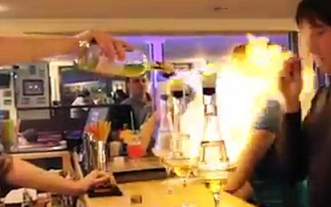 Η επαφή του αλκοόλ με τη φλόγα δημιουργεί μια μπάλα φωτιάς η οποία πετάγεται στη γυναίκα και τα μαλλιά της αρπάζουν αμέσως. Φυσικά, αστραπιαία η γυναίκα που φαίνεται να κάθεται αρχικά αμέριμνα, πετάγεται επάνω ουρλιάζοντας και τρέχει μέσα στο μπαρ σαν μια κινούμενη μπάλα φωτιάς.