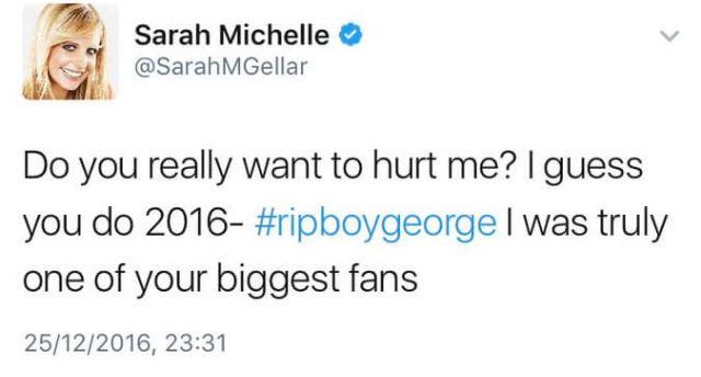 «Θέλεις πραγματικά να με πληγώσεις; Νομίζω το θέλεις 2016 – #ripboygeorge ήμουν πραγματικά μία από τις μεγαλύτερές σου φαν».