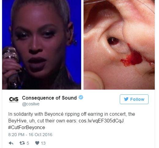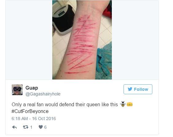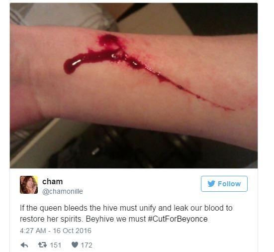 Ωστόσο, το συγκεκριμένο συμβάν προκάλεσε θύελλα αντιδράσεων στο Twitter καθώς οι περισσότεροι θαυμαστές της έσπευσαν να δηλώσουν την...συμπαράστασή τους, τραυματίζοντας τον εαυτό τους και ανεβάζοντας φωτογραφίες με hashtag #CutForBeyonce.