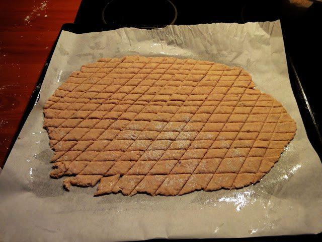 4. Σ' ένα ταψάκι προσθέτεις αντικολλητικό χαρτί και με 1 μαχαιράκι ή το εργαλείο κοπής πίτσας χαράζεις τη ζύμη μας 1x1 εκατοστά.